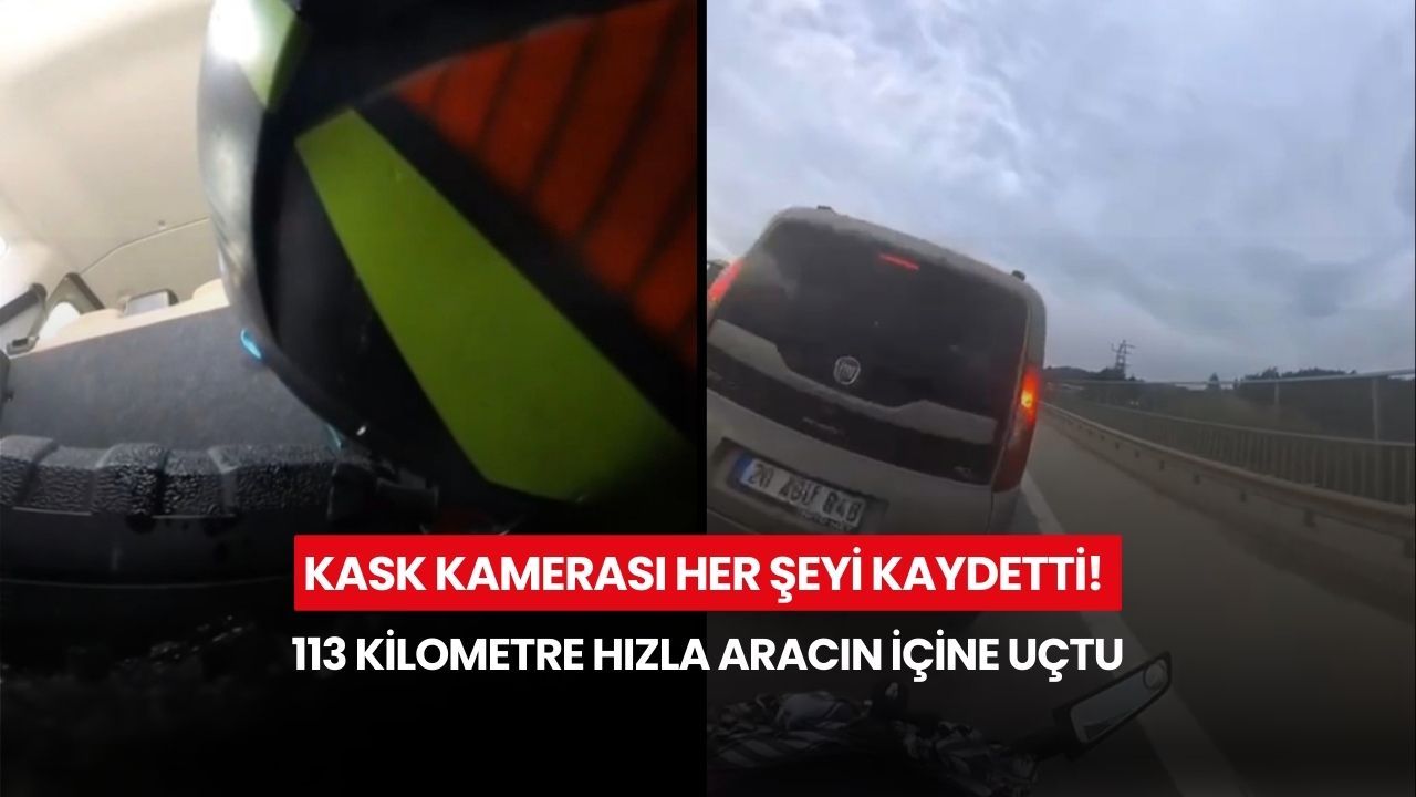 Kazada motosiklet sürücüsü, başını çarparak kırdığı aracın arka camından içeriye girdi. Belden yukarısı araç içinde kalan sürücünün kolları kırılırken, kaza kask kamerasına yansıdı.