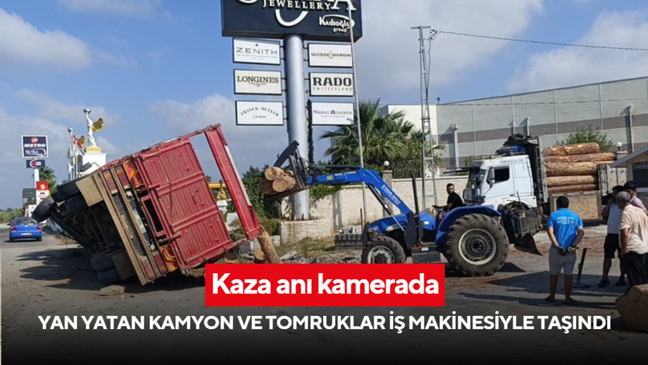 Vatandaşların ihbarı ile olay yerine sağlık ekipleri sevk edilirken, lastiğinin patlaması sonucunda meydana geldiği öğrenilen kazayı kamyon sürücüsü burnu bile kanamadan atlattı. Güvenlik kamerasına yansıyan kazanın ardından yan yatan kamyonun kasasındaki tomruklar olay yerine getirilen iş makinesi yardımıyla bir başka kamyona yüklendikten sonra kamyon tekerlerinin üzerine kaldırıldı.