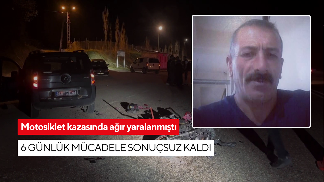 Tortum'da 6 gün önce meydana gelen trafik kazasında ağır yaralanan motosiklet sürücüsü Erdal Çetinkaya (52), tedavi gördüğü hastanede hayatını kaybetti.