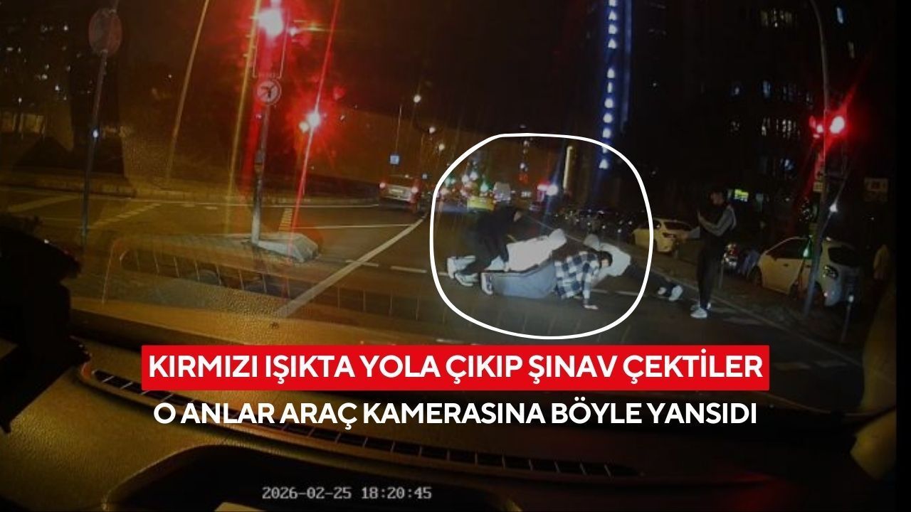 Üsküdar'da bir grup genç, kırmızı ışıkta bekledikleri sırada yaya geçidinde şınav çekti. O anlar, bir aracın kamerasına yansıdı.