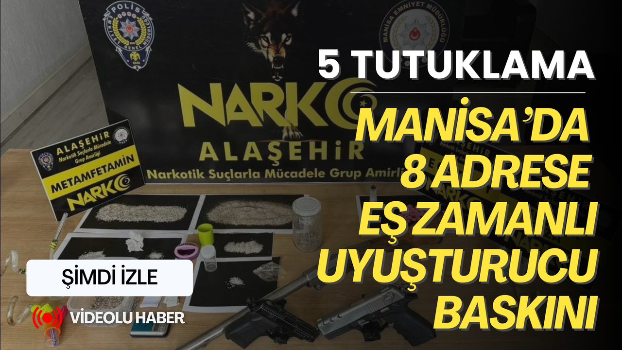 Manisa İl Emniyet Müdürlüğüne bağlı Narkotik Suçlarla Mücadele Şube Müdürlüğü Alaşehir Büro Amirliği ekiplerince "Uyuşturucu, Uyarıcı Madde İmal ve Ticareti” yaptığı değerlendirilen şahısların ikamet ettiği 8 adrese eş zamanlı operasyon düzenlendi. Yapılan operasyonda; İ.A. (31), A.E. (28), R.B (31), E.E.(32), S.M.S. (24), H.B. (31), S.B. (34), Y.Ö. (65) isimli 8 şüpheli şahıs yakalanarak gözaltına alınırken, şahısların yapılan ikamet ve iş yeri aramalarında; 127 gram metamfetamin maddesi, 1 adet hasas terazi, 40 adet extasy hap, 0,56 gram esrar maddesi, 4 adet sentetik ecza hapı, 2 adet içim aparatı, 2 adet tabanca, 1 adet av tüfeği ele geçirildi. Emniyetteki işlemlerinin ardından adli makamlara sevk edilen şahıslardan İ.A. (31), R.B (31), E.E.(32), H.B. (31) ve S.B. (34) isimli 5 şahıs tutuklandı. S.M.S. (24) isimli şahıs adli kontrol şartıyla serbest kalırken, A.E. (28) ve Y.Ö. (65) isimli şahıslar da serbest bırakıldı.