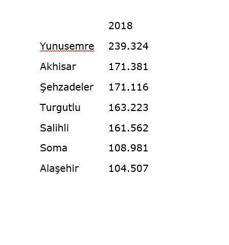 Son verilere göre Manisa'nın en kalabalık ilçesinde 239 bin 324 kişiyle Yunusemre ilçesi oldu. Yunusemre'yi, Akhisar, Şehzadeler ve Turgutlu takip etti. Salihli ise 5. Sırada yer aldı.