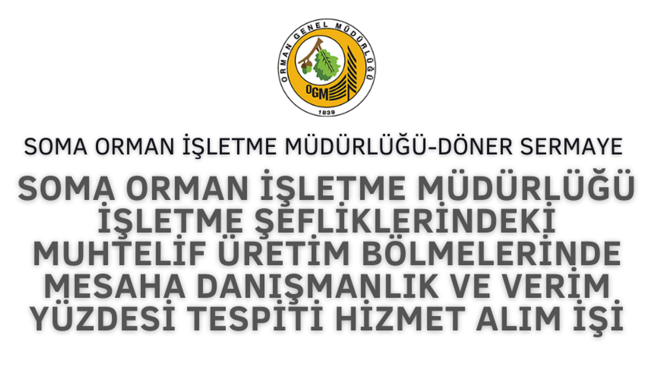Soma Orman İşletme Müdürlüğü İşletme Şefliklerindeki Muhtelif Üretim Bölmelerinde Mesaha Danışmanlık ve Verim Yüzdesi Tespiti Hizmet Alım İşi hizmet alımı 4734 sayılı Kamu İhale Kanununun 19 uncu maddesine göre açık ihale usulü ile ihale edilecek olup, teklifler sadece elektronik ortamda EKAP üzerinden alınacaktır. İhaleye ilişkin ayrıntılı bilgiler aşağıda yer almaktadır: