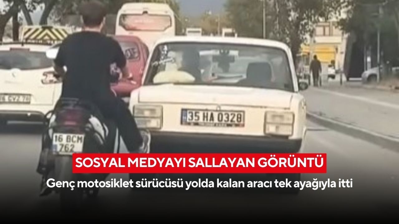 Olay, çevredeki vatandaşlar tarafından cep telefonuyla kaydedildi. Görüntülerde motosikletli gencin, dengesini bozmadan tek ayağıyla otomobili ittiği ve aracın hareket etmesini sağladığı anlar yer aldı.
