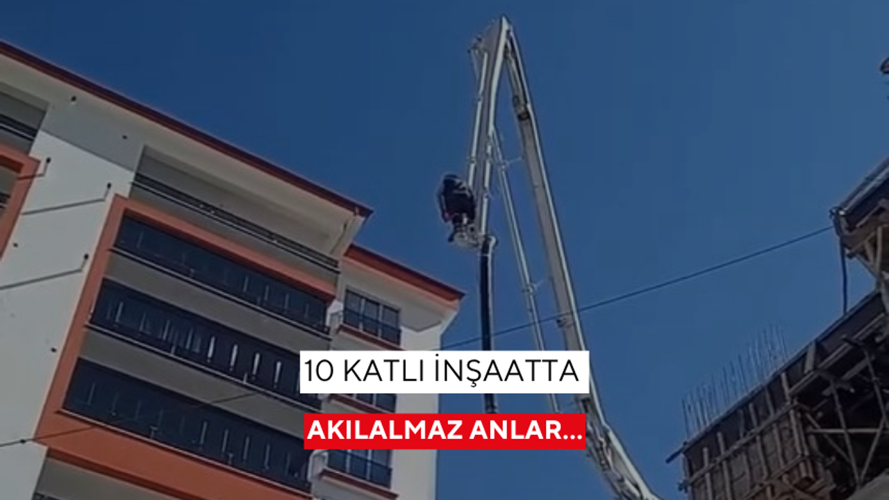 Bir işçi, beton pompa aracının hortumuna binerek metrelerce yüksekliğe çıkıp canını hiçe saydı. O anlar cep telefonu kamerasına yansıdı.