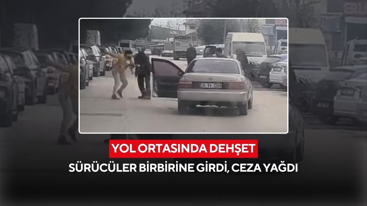 Bursa'da iki sürücünün yol ortasında yumruk yumruğa kavga ettiği anlar kameraya yansıdı. Taraflara toplam 360 bin lira ceza kesilirken, ehliyetlerine ve araçlarına 2 ay süreyle el konuldu.