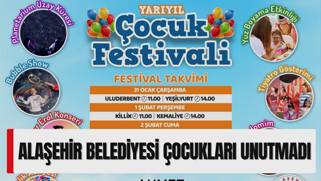 Alaşehir Belediyesi Şehit Fethi Sekin Gençlik Merkezinde Yarıyıl Çocuk Festivali düzenliyor. Yarıyıl tatilinde çocuklar için 'Yüz Boyama Etkinliği', 'Tiyatro Gösterimi', 'Bubble Show', 'Onur Erol Konseri', 'Etkinlik Atölyesi', 'Pandomim' ve daha fazla etkinlikler çocukların doya doya eğlenmesini sağlayacak.